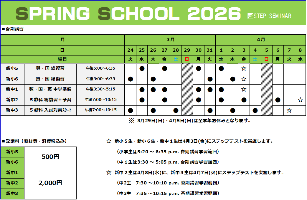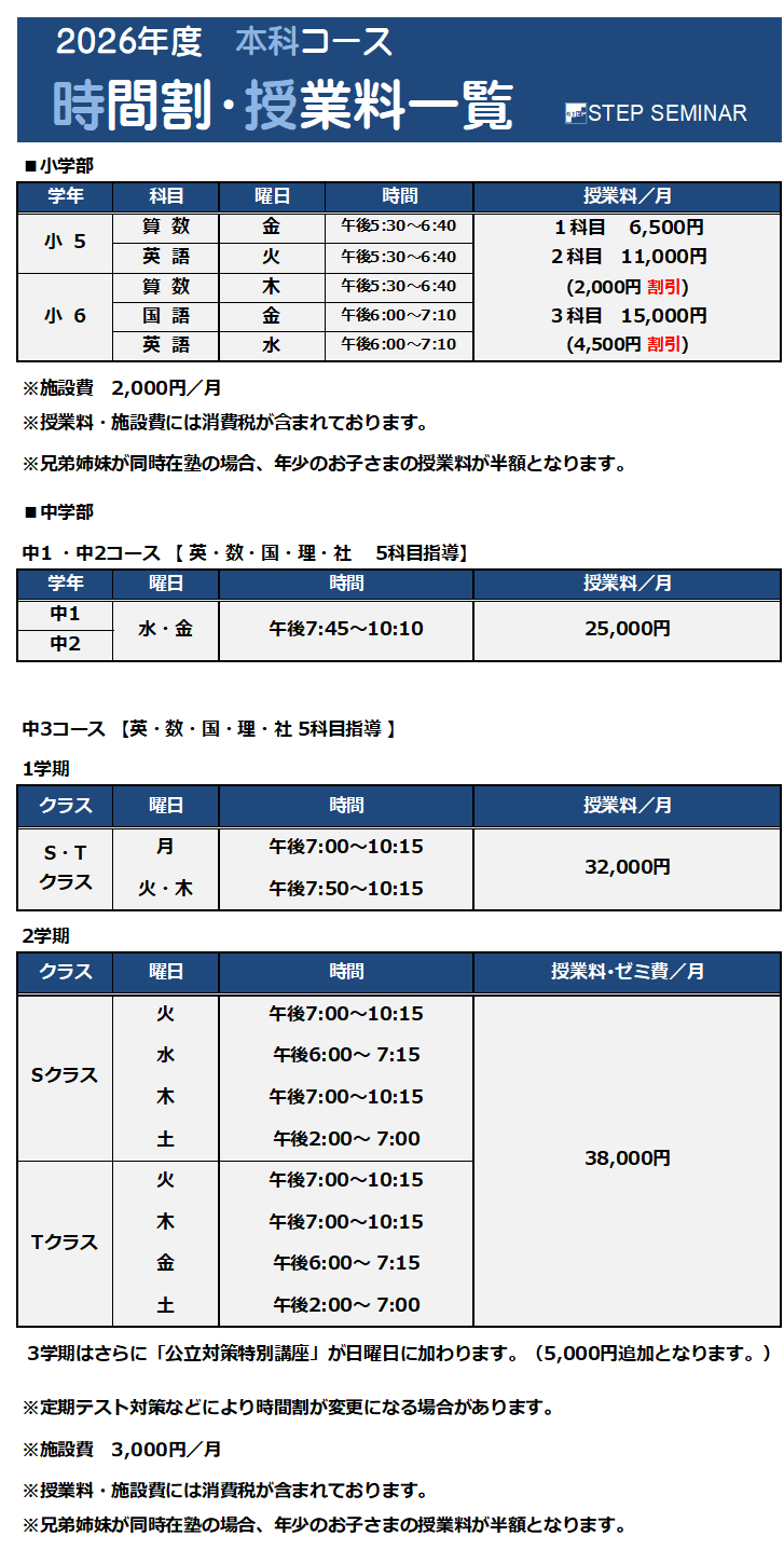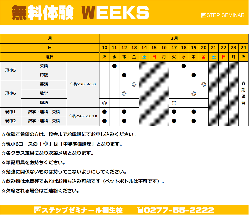 桐生相生校 Schedule 2026, 2月 26 木曜日 公立高校 追検査学力検査等実施 2026, 2月 28 土曜日 面談集中日② ※各予定は学校行事や校舎の事情により変更になることがございます。 ※ご了承くださいますようお願い致します。 桐生相生校 〒376-0011 群馬県桐生市相生町3-234 TEL 0277-55-2222 FAX 0277-55-2223 トップに戻る